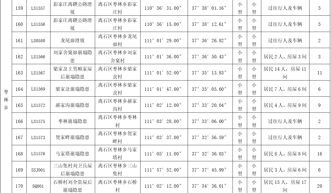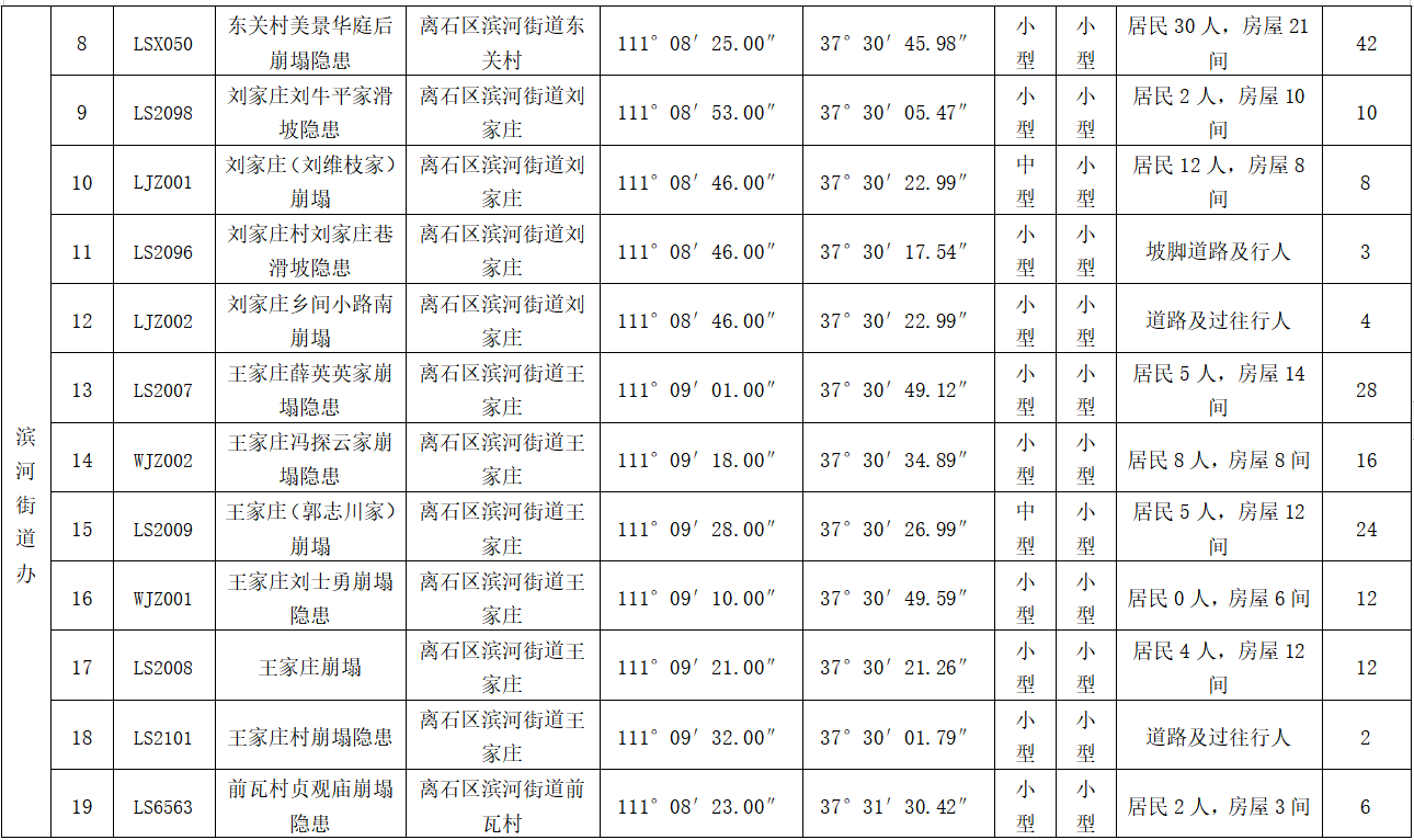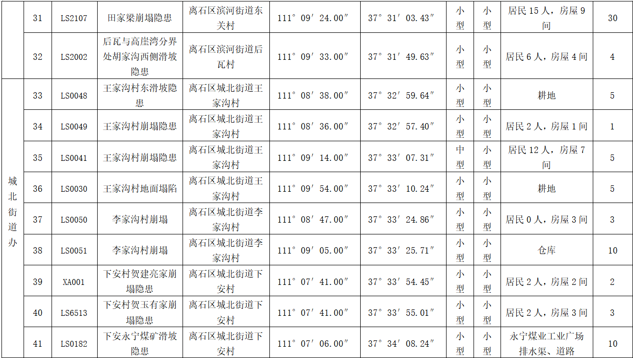 我区地质灾害点主要分布在三川河流域河谷两侧黄土分布区。其中崩塌隐患点、滑坡隐患点主要分布于城区周边黄土覆盖区及村镇周边的黄土覆盖区。地面塌陷主要分布于城北街道、西属巴街道、交口街道及滨河街道、田家会街道、莲花池街道、坪头乡等采煤塌陷分布地区。防治重点是村庄、厂矿、学校、209国道、307国道、离柳高速公路及其他乡镇(街道)道路周围的小规模黄土崩塌、滑坡及地面塌陷等地质灾害。
