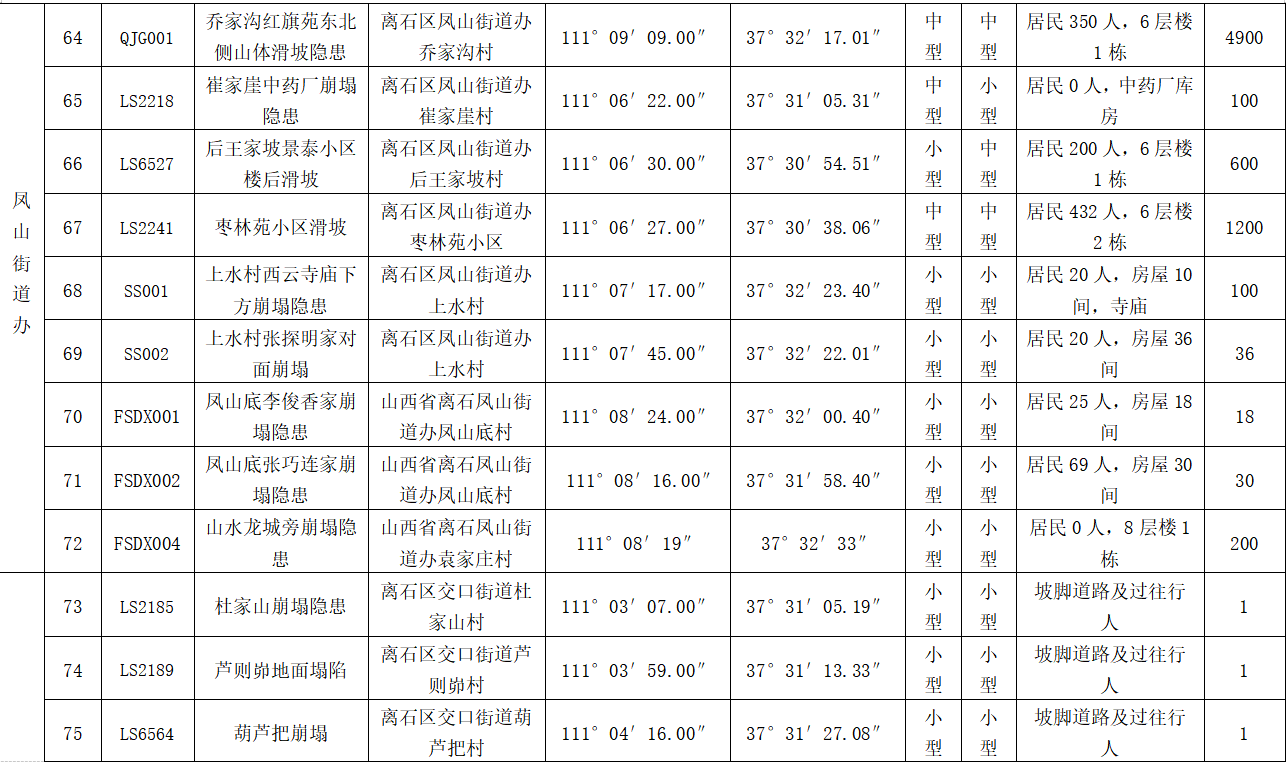 按照灾害点规模大小、危害程度、险情等级重点对以下20处灾害点进行重点监测,分别为滨河街道后瓦窑坡村后瓦四巷崩塌隐患点、后瓦窑坡村后宋家沟、吴家沟崩塌隐患点、东关崩塌隐患点;莲花池街道疙瘩上村九州太阳城楼南崩塌隐点,南关村滑坡隐患点;凤山街道乔家沟东过境隧道南北两侧崩塌隐患点、后王家坡村枣林苑小区、景泰小区后侧滑坡隐患点、崔家崖村崩塌隐患点、张探明家两侧边坡崩塌隐患点;西崖底村任卫平家两侧边坡崩塌隐患点、袁家庄崩塌隐患点;西属巴街道上安村上清观滑坡隐患点;信义镇崖窑湾村滑坡隐患点;吴城镇下王营庄崩塌隐患点;城北街道李家沟地面塌陷隐患点;交口街道安国寺滑坡隐患点、安国寺崩塌隐患点;坪头乡赵家山崩塌隐患点。