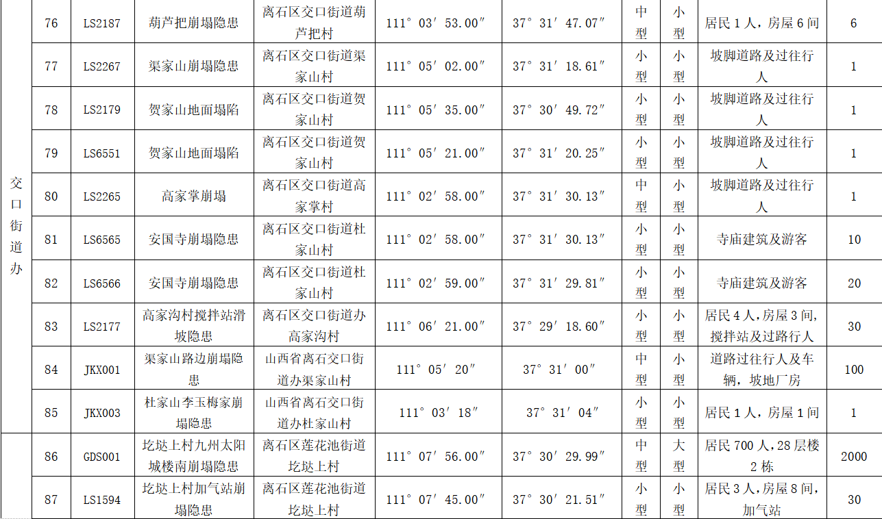本方案所指的重要地质灾害隐患点(地区、段)包括:规模大、威胁人口多、社会影响大、经济损失严重、危险性大的地质灾害隐患点。上述隐患点(地区、段)受暴雨及人类工程活动等因素的影响,易诱发崩塌、滑坡、地裂缝、地面塌陷等地质灾害,应采取有效措施予以重点防范。