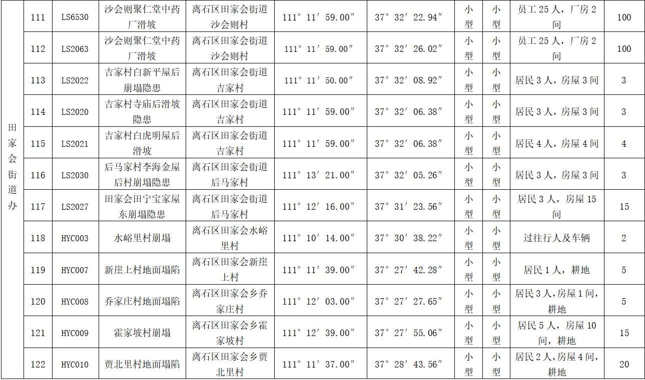 我区境内山高坡陡,沟壑纵横,为典型的黄土高原丘陵沟壑区,地形落差大,自然地质条件脆弱,易发生地质灾害。截至2021年底,有入库的地质灾害隐患点175处,均分布 11个乡镇(街道),直接威胁人口3803人,房屋约720间,道路1000米、威胁财产约1.63亿元。按险情等级划分:大型1处、中型12处、小型162处;按灾种划分:崩塌隐患109处,滑坡隐患20处、崩塌17处、滑坡17处、地面塌陷12处,地质灾害隐患多、分布广,受地质灾害威胁程度日趋加重的基本形势短时期内难以扭转。