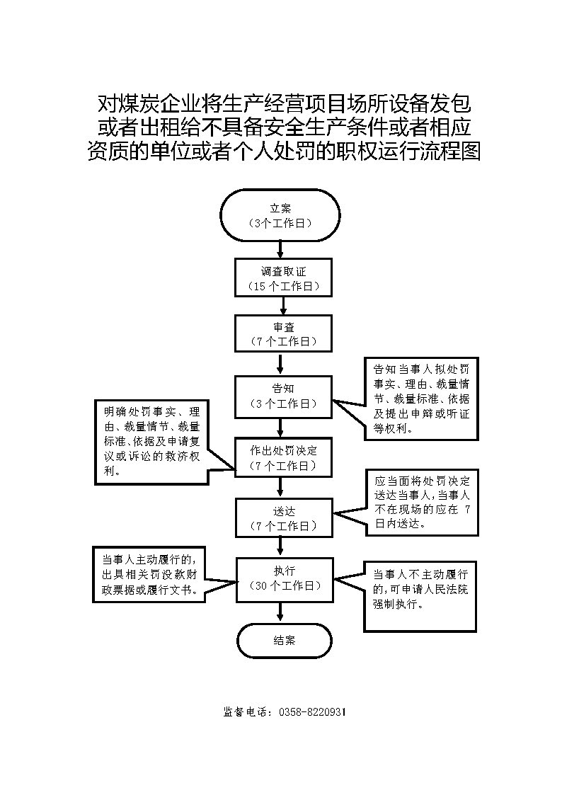 1、立案责任:发现辖区内的煤炭生产经营单位的决策机构、主要负责人或者个人经营的投资人不依照本法规定保证安全生产所必需的资金投入,致使生产经营单位不具备安全生产条件的违法行为(或者下级煤炭管理部门上报或其他机关移送的违法案件等),应及时予以审查,决定是否立案。 2、调查责任:煤炭管理部门对立案的案件,指定专人负责,及时组织调查取证,执法人员应保守有关秘密。 3、审查责任:审理案件调查报告,对案件违法事实、证据、调查取证程序、法律适用、处罚种类和幅度、当事人陈述和申辩理由等方面进行审查,提出处理意见(主要证据不足时,以适当的方式补充调查)。 4、告知责任:作出行政处罚决定前,应制作《行政处罚告知书》送达当事人,告知违法事实及其享有的陈述、申辩等权利。符合听证规定的,制作并送达《行政处罚听证告知书》。 5、决定责任:制作行政处罚决定书,载明行政处罚告知、当事人陈述申辩或者听证情况等内容。 6、送达责任:行政处罚决定书按法律规定的方式送达当事人。 7、执行责任:依照生效的行政处罚决定,监督当事人履行。当事人逾期不履行的,可依法采取加处罚款、申请法院强制执行8、其他法律法规规章文件规定应履行的责任。 |
