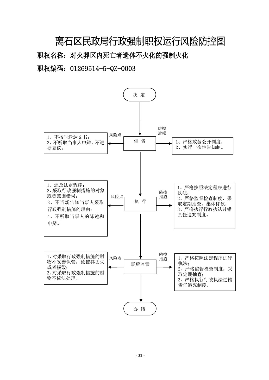 | 行政强制 | 01269514-5-QZ-0003 | 对火葬区内死亡者遗体不火化的强制火化 | 【地方政府规章】《山西省殡葬管理办法》(省政府令第145号)第三十一条 | 1.立案责任:监督检查或者接到举报等后,对符合立案条件的违法违规问题,依法予以立案;2.调查责任:对火葬区内死亡者遗体不火化的强制火化要遵循客观事实,对相关材料进行核实、取证、收集。3.审查责任:调查终结,行政机关负责人应当对调查结果进行审查,根据不同情况作出决定。4.告知责任:书面告知当事人作出行政处罚决定的事实、理由及依据,并依法享有的陈述、申辩、听证等权利。5.决定责任:对火葬区内死亡者遗体不火化的强制火化前,当事人提出的陈述和申辩意见,应充分听取,并进行复核;当事人提出的事实、理由或者证据成立的,应当采纳。当事人要求听证的,应当组织听证。对决定给予行政处罚的,应当制作行政处罚决定书。行政处罚决定书要载明违法事实和证据、处罚依据和内容、申请行政复议或提起行政诉讼的途径和期限等内容。6.送达责任:行政处罚决定书应当在宣告后当场交付当事人;当事人不在场的,应当在七日内,依照民事诉讼法的有关规定送达当事人。7.执行责任:严格按照行政处罚决定予以执行。8.其他责任:法律法规规章文件规定应履行的责任。 | 1.对符合对强制火化条件的案件不予立案的;对不符合条件的案件予以受理、立案的或超出法定职权作出准予立案的;2.没有强制火化法律或者事实依据实施行政强制的;3.未按法定程序实施行政强制的;4.指派不具备行政执法资格的人员实施行政强制的;5.擅自改变行政强制幅度、范围的;6.执法中索取或收受他人财物或者谋取其他利益的;7.玩忽职守,对违法行为不予制止、处罚,致使公民、法人或其他组织的合法权益、公共利益和社会秩序遭受损害的; 8.其他违反法律法规规章文件规定的行为。 | 【法律】《行政强制法》 第六十一条至第六十四条,《公务员法》第五十三至五十五条;【行政法规】《行政机关公务员处分条例》(国务院第495号令);【规章】《山西省殡葬管理办法》(省政府令第145号)第三十六条,《事业单位工作人员处分暂行规定》(人社部、监察部第18号令);【地方性法规】《山西省行政执法条例》第十三条、第四十至四十二条;【党内法规】《中国共产党纪律处分条例》;【规范性文件】《山西省行政机关及其工作人员行政过错责任追究暂行办法》,《吕梁市行政执法责任追究暂行办法》第九条、第二十三至二十五条。 | 一、行政处理1、诫勉谈话或者责令书面检讨;2、通报批评;3、暂扣行政执法证件;4、责令离岗培训;5、调离执法岗位;6、取消执法资格;7、依法追偿部分或者全部行政赔偿费用。二、行政处分:警告、记过、记大过、降级、撤职、开除。三、党纪处分:警告、严重警告、撤销党内职务、留党察看、开除党籍。 四、其他法律责任。 | ||
