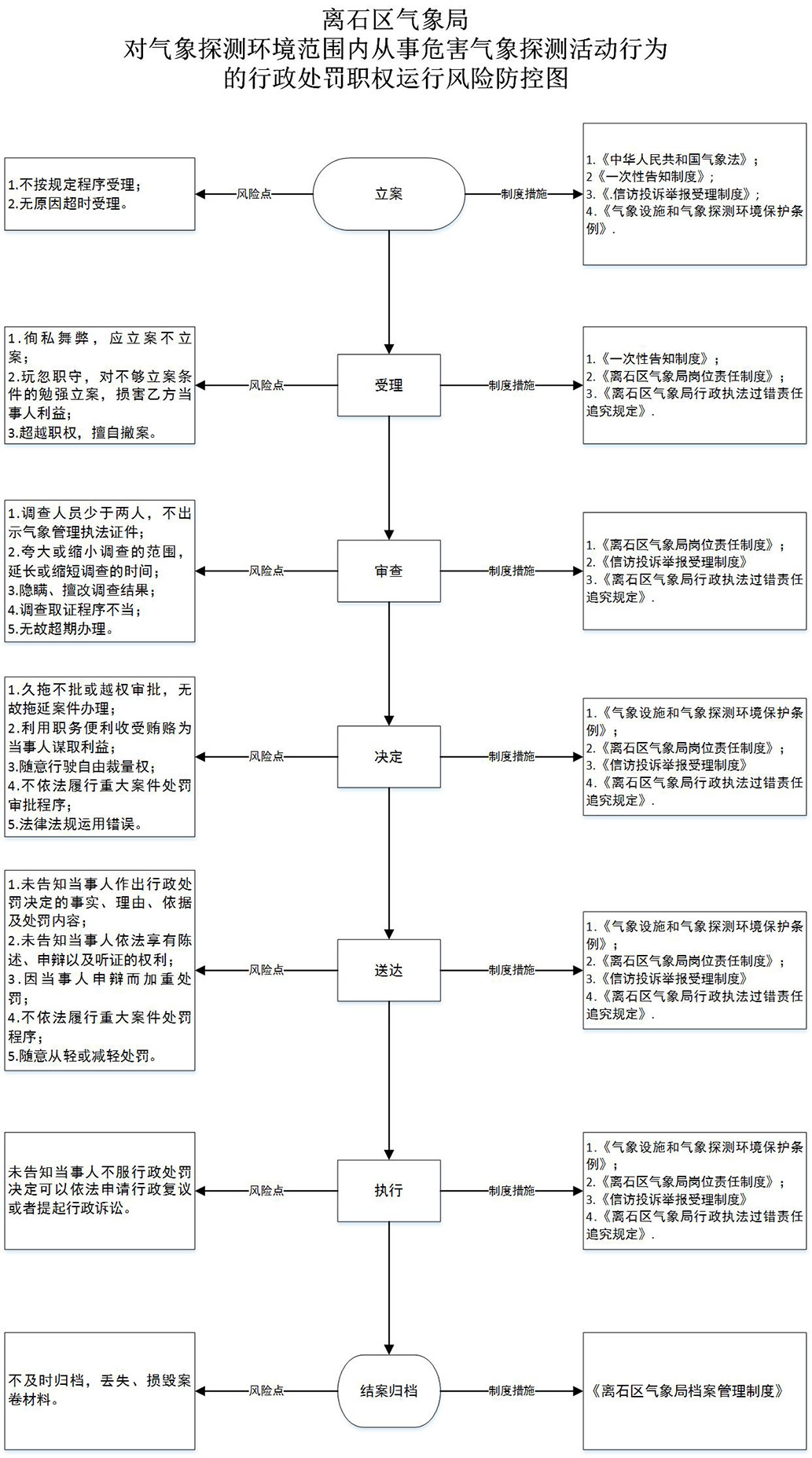 1、立案责任:发现和受理移交的违法行为,予以审查,决定是否立案。 2、调查责任:对立案的案件,指定专人负责,及时组织调查取证,与当事人有直接利害关系的应当回避。执法人员不得少于两人,调查时应出示执法证件,允许当事人辩解陈述。执法人员廉洁奉公保守有关秘密。 3、审查责任;审查案件调查报告,对案件违法事实、证据、调查取证程序、法律适用、处罚种类和幅度、当事人陈述和申辩理由等方面进行审查,提出处理意见(主要证据不足时,以适当的方式补充调查)。 4、告知责任:作出行政处罚决定前,应制作《行政处罚告知书》送达当事人,告知违法事实及其享有的陈述、申辩等权利。符合听证规定的,制作《行政处罚听证告知书》。 5、决定责任:制作行政处罚决定书,载明行政处罚告知、当事人陈述申辩或者听证情况等内容。 6、送达责任:行政处罚决定书按法律规定的方式送达当事人。 7、执行责任:依照生效的行政处罚决定,进行处罚产。 8、其他:法律法规规章规定应履行的责任。 |
