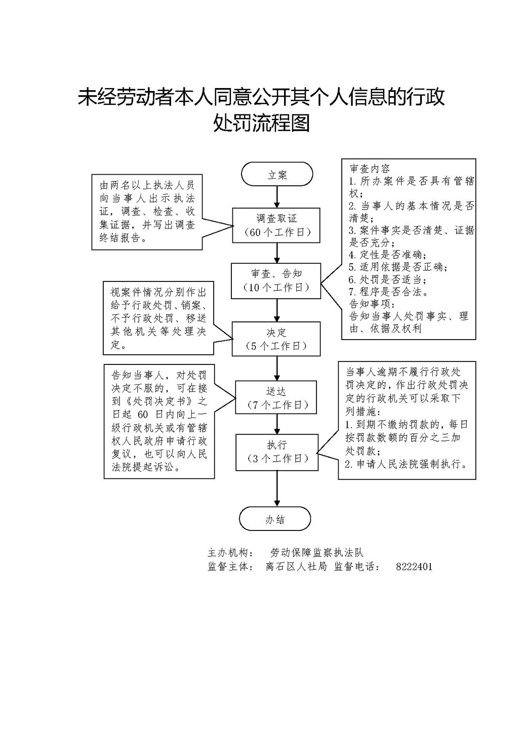 1.立案责任:符合用人单位未经 劳动者本人同意公开其个人信息 的处罚条件的予以立案,对材料 不全的,一次性告知所需材料。 2.调查责任:遵循客观事实,对 应该取证的进行取证。 3.审查责任:对取证材料进行认 真审查核实,需补充取证的及时 补证。 4.告知责任:在规定时间内告知 被处罚单位处罚理由。作出行政 处罚决定前,应制作《行政处罚 听证告知书》送达当事人,告知 违法事实及其享有的陈述、申辩 等权利。 5.决定责任:作出行政处罚决定 应严格审查。制作行政处罚决定 书,应载明必备内容。 6.送达责任:行政处罚决定书按 法律规定的方式送达当事人。 7.执行责任:依照生效的行政处 罚决定采取执行措施。 8.其他:法律法规规章规定应履 行的责任。 |