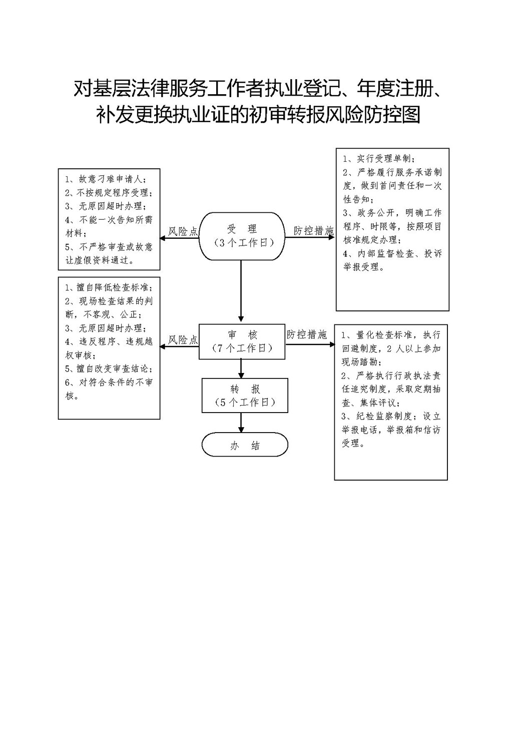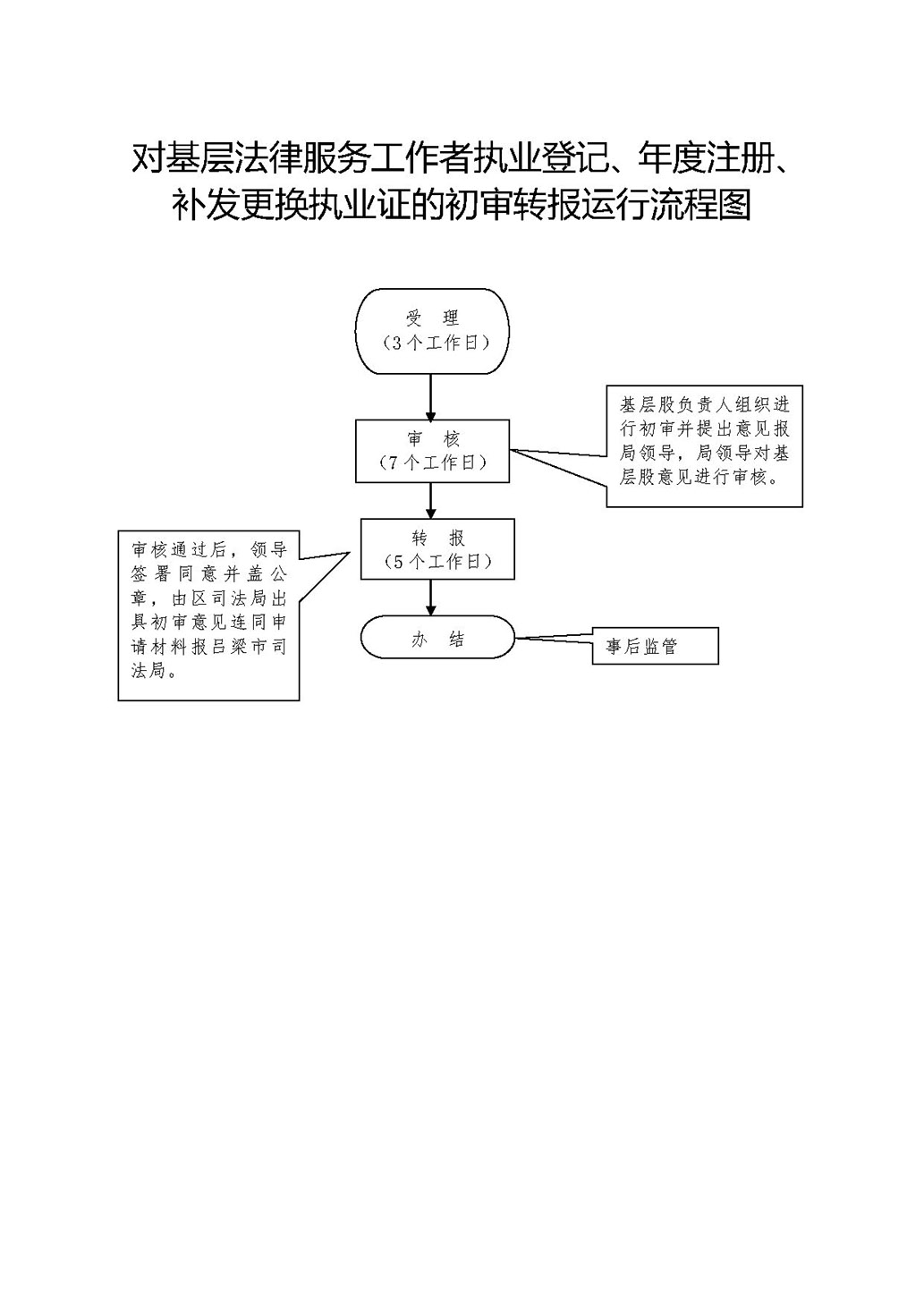 | 其他权力 | 73634798-X-QT-0004 | 基层法律服务工作者执业登记、年度注册、补发更换执业证的初审转报 | 【行政法规】《基层法律服务工作者管理办法》(司法部令第60号)第十七条 | 1、受理阶段的责任:一次性告知当事人带好材料到区司法局基层股申请,对申请材料不全或材料不符合要求的一次性告知申请人补充。 2、审核阶段的责任:基层股组织进行初审并提出意见报局领导。 3、复审阶段的责任:局领导对基层股意见进行审核。 4、决定阶段的责任:审核通过后,领导签署同意并盖公章,由区司法局出具初审意见连同申请材料报市司法局。 |