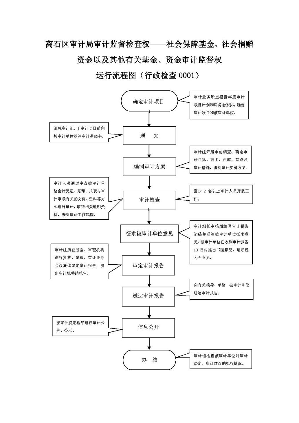 | 行政检查 | 01269565-5-JC-0001 | 审计监督检查 | 【法律】《中华人民共和国审计法》第二十三条; 【行政法规】《中华人民共和国审计法实施条例》第二十一条。 | 1.确定审计项目和被审计单位阶段责任:审计机关业务股室根据审计局年度项目计划和局务会议安排,确定项目和被审计单位,组成审计组制发审计通知书。 2.审计实施阶段责任:审计组开展审计调查,编制审计实施方案,采取检查、调查、查询等方法取得审计证据,编制审计记录;审计组组长审核确认审计工作底稿、审计证据等,确认审计目标是否实现。审计组起草审计报告等审计结论性文书,按规定程序征求被审计单位意见。 3.审计结果阶段责任:审计组所在的业务股室、审理部门对代拟的审计报告等审计结论文书、审计全过程材料进行复核、审理;审计机关业务会议集体审定审计报告等审计结论文书,特殊情况下,经审计机关主要负责人授权,可以由审计机关其他负责人审定;出具审计报告,下达审计决定。对被审计单位违反国家规定的财政财务收支行为,提出处理措施并可以依法给予处罚;对依法应当追究有关人员责任的,向有关主管机关、单位提出给予处分的建议;涉嫌犯罪的,移送司法机关。 4.决定公布阶段责任:根据法律法规规定,依照法定程序向政府有关部门通报或者向社会公布审计结。; 5.事后监管阶段责任:审计机关应当在审计结束后,检查审计报告、审计决定等执行情况。 6.其他法律法规规章文件规定应履行的责任。 |