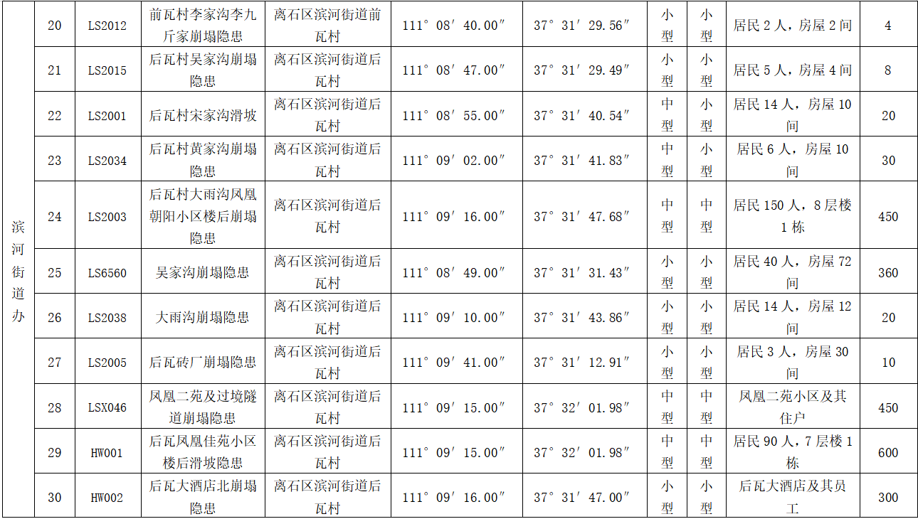 按照灾害点规模大小、危害程度、险情等级重点对以下20处灾害点进行重点监测,分别为滨河街道后瓦窑坡村后瓦四巷崩塌隐患点、后瓦窑坡村后宋家沟、吴家沟崩塌隐患点、东关崩塌隐患点;莲花池街道疙瘩上村九州太阳城楼南崩塌隐点,南关村滑坡隐患点;凤山街道乔家沟东过境隧道南北两侧崩塌隐患点、后王家坡村枣林苑小区、景泰小区后侧滑坡隐患点、崔家崖村崩塌隐患点、张探明家两侧边坡崩塌隐患点;西崖底村任卫平家两侧边坡崩塌隐患点、袁家庄崩塌隐患点;西属巴街道上安村上清观滑坡隐患点;信义镇崖窑湾村滑坡隐患点;吴城镇下王营庄崩塌隐患点;城北街道李家沟地面塌陷隐患点;交口街道安国寺滑坡隐患点、安国寺崩塌隐患点;坪头乡赵家山崩塌隐患点。