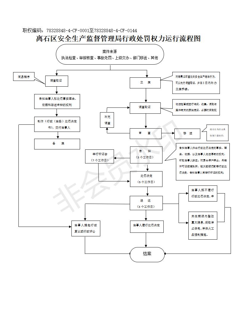 1、立案责任:在检查中或者事故调查过程中发现、或者接到举报、或部门移交的违法案件,予以审查,决定是否立案。 2、调查责任:对已经立案的案件,进行调查时,执法人员不得少于两人,与当事人有直接利害关系的应当回避。调查时应出示执法证件,收集相关证据,允许当事人辩解陈述,执法人员应保守有关秘密。 3、审查责任:对案件违法事实、证据、调查取证程序、法律适用、处罚种类和幅度、当事人陈述和申辩理由等方面进行审查,提出处理意见,拟作出严重违法行为的处罚,由安监部门负责人集体讨论决定。 4、告知责任:在做出行政处罚决定前,制作《行政处罚告知书》,符合听证条件的制作《听证告知书》,通知当事人,当事人享有的陈述、申辩、要求听证的权利。 5、决定责任:根据审理情况决定是否予以行政处罚。依法需要给予行政处罚的,制作《行政处罚决定书》,载明违法事实和证据、处罚依据和内容、缴纳罚款的银行、申请行政复议或提起行政诉讼的途径和期限等内容。 6、送达责任:《行政处罚决定书》按照法定的方式和期限送达当事人。 7、执行责任:监督当事人在决定的期限内,履行生效的处罚决定。当事人在法定期限内不申请行政复议或者提起行政诉讼,又不履行的,发出催缴通知,加收罚款滞纳金,再不履行的向人民法院申请强制执行。 |