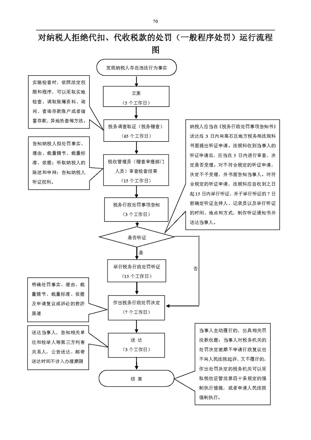 1、立案责任:税务机关根据日常管理中发现或者接到举报、控告的纳税人拒绝代扣、代收税款违法行为案件,应予以审查,决定是否立案。 2、调查责任:指定专人负责,对纳税人拒绝代扣、代收税款违法行为证据调查取证,与当事人有直接利害关系的应当回避。执法人员不得少于两人,调查时应出示执法证件,允许当事人辩解陈述,执法人员应保守有关秘密。制作调查检查报告。 3、审查责任:对纳税人拒绝代扣、代收税款案件的违法事实、证据、调查取证程序、法律适用、处罚种类和幅度、当事人的陈述和申辩理由等方面进行审查,提出处理意见。 4、告知责任:做出纳税人拒绝代扣、代收税款行政处罚决定前,应书面告知当事人违法事实及其享有的陈述、申辩、要求听证等权利。 5、决定责任:制作行政处罚决定书,载明行政处罚告知、当事人陈述申辩或者听证情况等内容。 6、送达责任:将行政处罚决定书按法律规定的方式送达当事人。 7、执行责任:将罚款在处罚决定规定的期限内追缴入库。当事人在法定期限内不申请行政复议或者提起行政诉讼,又不履行处罚决定的,税务机关可依法采取加处罚款、查封扣押或向人民法院申请强制执行等措施。 8、其他法律法规规章文件规定应履行的责任。 |