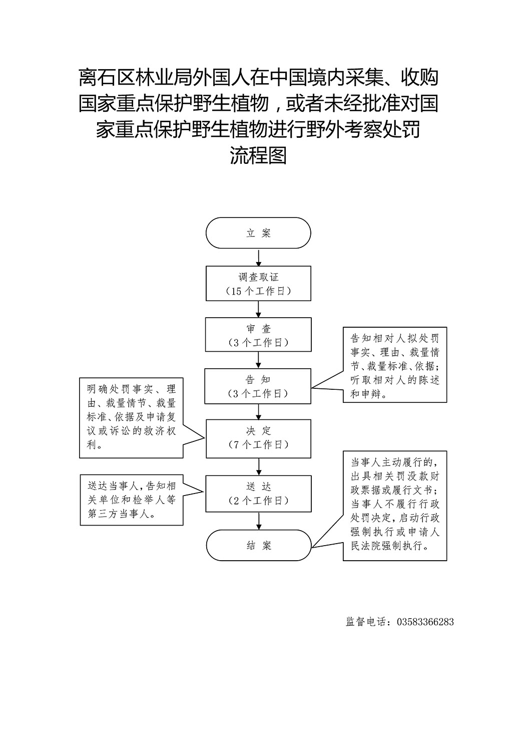 1、立案责任:发现外国人在中国境内采集、收购国家重点保护野生植物,或者未经批准对国家重点保护野生植物进行野外考察的违法行为,予以审查、决定是否立案。 2、调查责任:林政股对立案的案件,指定专人负责,及时组织调查取证,与当事人有直接利害关系的应到回避。执法人员不得少于两人,调查时应出示执法证件,允许当事人辩解陈述。执法人员应保守有关秘密。 3、审查责任:审理案件调查报告,对案件违法事实、证据、调查取证程序、法律适用、处罚种类和幅度、当事人陈述和身边理由等方面进行审查,提出处理意见(主要证据不足时,以适当的方式补充调查)。 4、告知责任:做出行政处罚决定前,应制作《行政处罚告知书》送达当事人,告知违法事实及其享有的 陈述、申辩等权利。符合听证规定的,制作并送达《行政处罚听证告知书》。 5、决定责任:制作行政处罚决定书,载明行政处罚告知、当事人陈述申辩或者听证情况等内容。 6、送达责任:行政处罚决定书按法律规定的方式送达当事人 7、执行责任:依照生效的行政处罚决定,进行处罚。 8、其他法律法规规章文件规定应履行的责任。 |