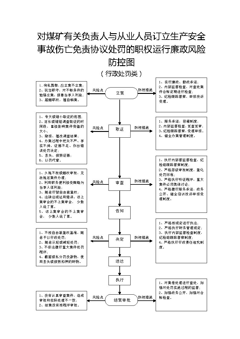 | 行政处罚 | 77671572-4-CF-0016 | 对煤矿有关负责人与从业人员订立生产安全事故伤亡免责协议的处罚 | 【法律】《中华人民共和国安全生产法》第九条、第一百零三条; 【规章】《安全生产违法行为行政处罚办法》(国家安监总局第15号令)第四十六条 |