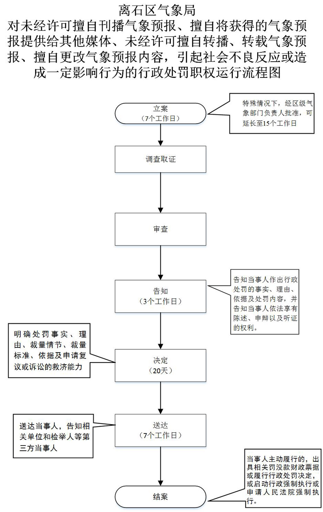 | 行政处罚 | 40763058-1-CF-0004 | 对未经许可擅自刊播气象预报、擅自将获得的气象预报提供给其他媒体、未经许可擅自转播、转载气象预报、擅自更改预报内容,引起社会不良反应或造成一定影响行为的处罚 | 《气象预报发布与刊播管理办法》第十三条 |