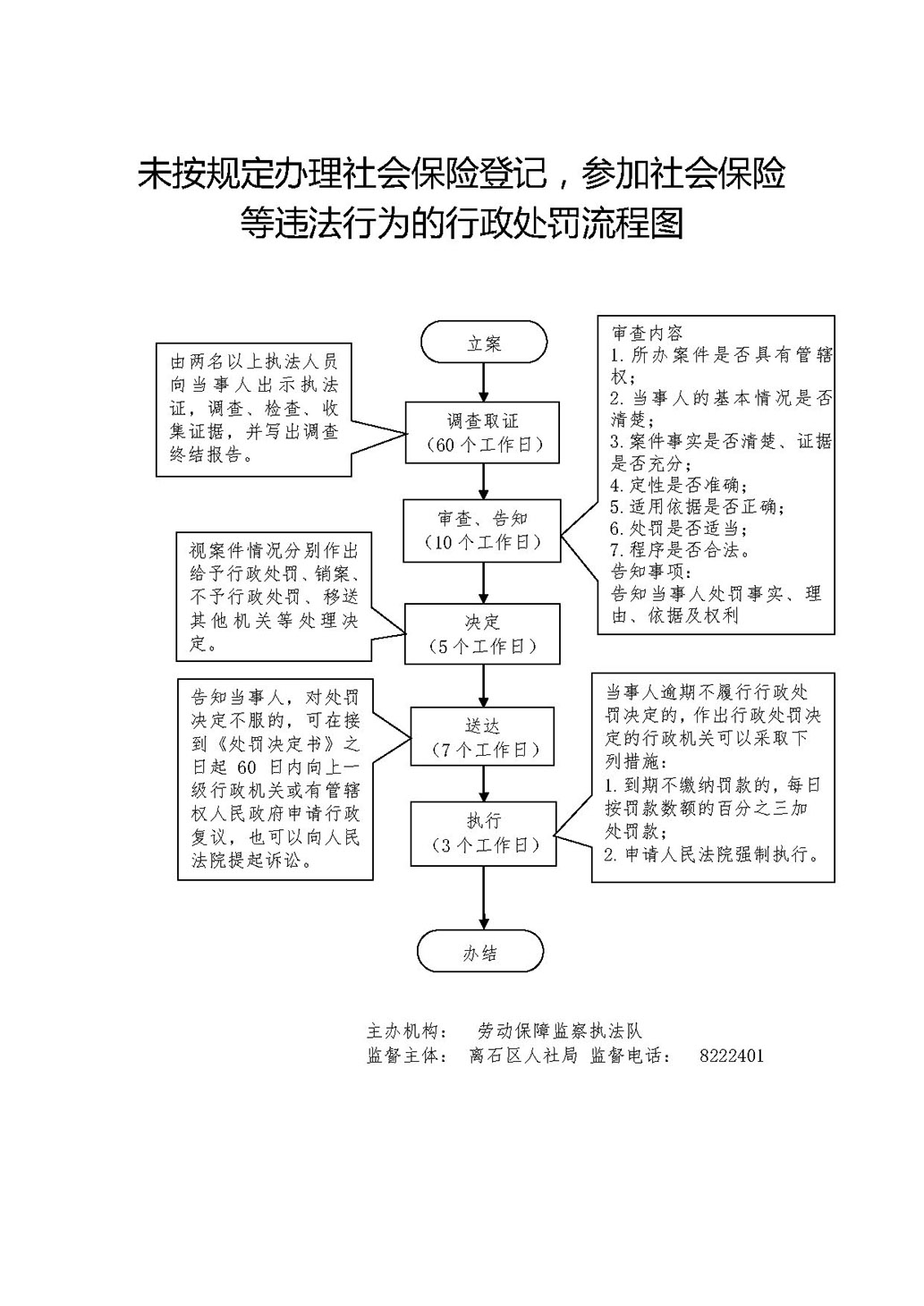 1.立案责任:符合对缴费单位未 按照规定办理社会保险登记、变 更登记或者注销登记,或者未按 照规定申报应缴纳的社会保险费 数额的处罚条件的予以立案,对 材料不全的,一次性告知所需材 料。 2.调查责任:遵循客观事实,对 应该取证的进行取证。 3.审查责任:对取证材料进行认 真审查核实,需补充取证的及时 补证。 4.告知责任:在规定时间内告知 被处罚单位处罚理由。作出行政 处罚决定前,应制作《行政处罚 听证告知书》送达当事人,告知 违法事实及其享有的陈述、申辩 等权利。 5.决定责任:作出行政处罚决定 应严格审查。制作行政处罚决定 书,应载明必备内容。 6.送达责任:行政处罚决定书按 法律规定的方式送达当事人。 7.执行责任:依照生效的行政处 罚决定采取执行措施。 8.其他:法律法规规章规定应履 行的责任。 |