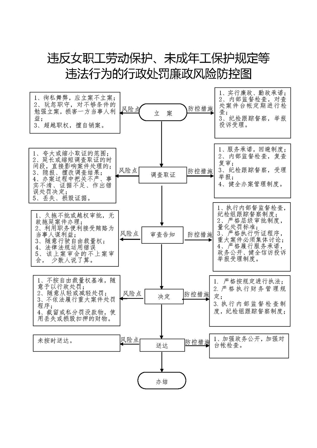 1.立案责任:发现侵害女职工和未成年工合法权益的行为,对符合立案条件的予以立案,对属举报投诉的材料不全的,一次性告知所需材料。 2.调查责任:遵循客观事实,对应该取证的进行取证。 3.审查责任:对取证材料进行认真审查核实,需补充取证的及时补证。 4.告知责任:在规定时间内告知被处罚单位处罚理由。作出行政处罚决定前,应制作《行政处罚听证告知书》送达当事人,告知违法事实及其享有的陈述、申辩等权利。 5.决定责任:作出行政处罚决定应严格审查。制作行政处罚决定书,应载明必备内容。 6.送达责任:行政处罚决定书按法律法规的方式送达当事人。 7.执行责任:依照生效的行政处罚决定采取执行措施。 8.其他:法律法规规章规定应履行的责任。 |