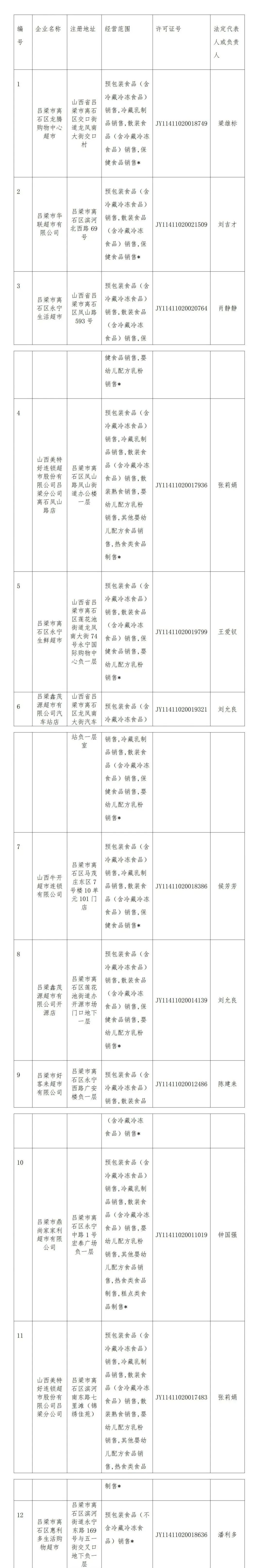 根据省市区《关于深入开展“放心食品超市自我承诺”活动的通知》文件要求,为切实贯彻落实习近平总书记“四个最严”要求,进一步落实食品安全主体责任自我承诺制度,推动食品销售者不断加强自律,严格落实食品安全主体责任,共同营造放心、舒心的食品消费环境,形成食品经营主体诚信守法、规范经营的良好风尚。吕梁市365bet线上投注_365游戏注册_office365邮箱手机版市场监督管理局组织开展了“放心食品超市自我承诺”活动,现就对2022年度“放心食品超市自我承诺”企业名单予以公示,请社会各界及消费者进行监督。监督电话:12315